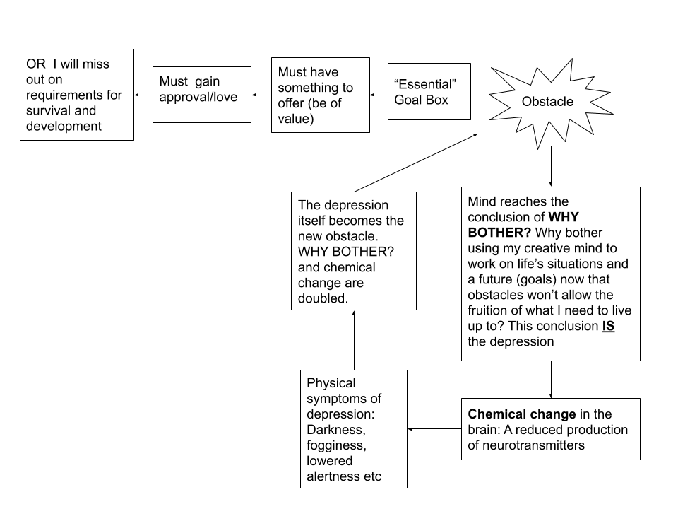 Consequently, if ever one day we reach the conclusion that: due to circumstances, we believe there are too many obstacles preventing us from ever being able to achieve that which is in our “essential” goal box, our mind will become psychologically devastated. We then hold the conclusion that there is now no point in possessing goals and working on a future: “What is the point in even having goals and working on a future if you can’t achieve what you want?”. WHY BOTHER? This conclusion turns particular sectors of the mind down, thus decreasing the level of neurotransmitter production. That is stage one of depression.